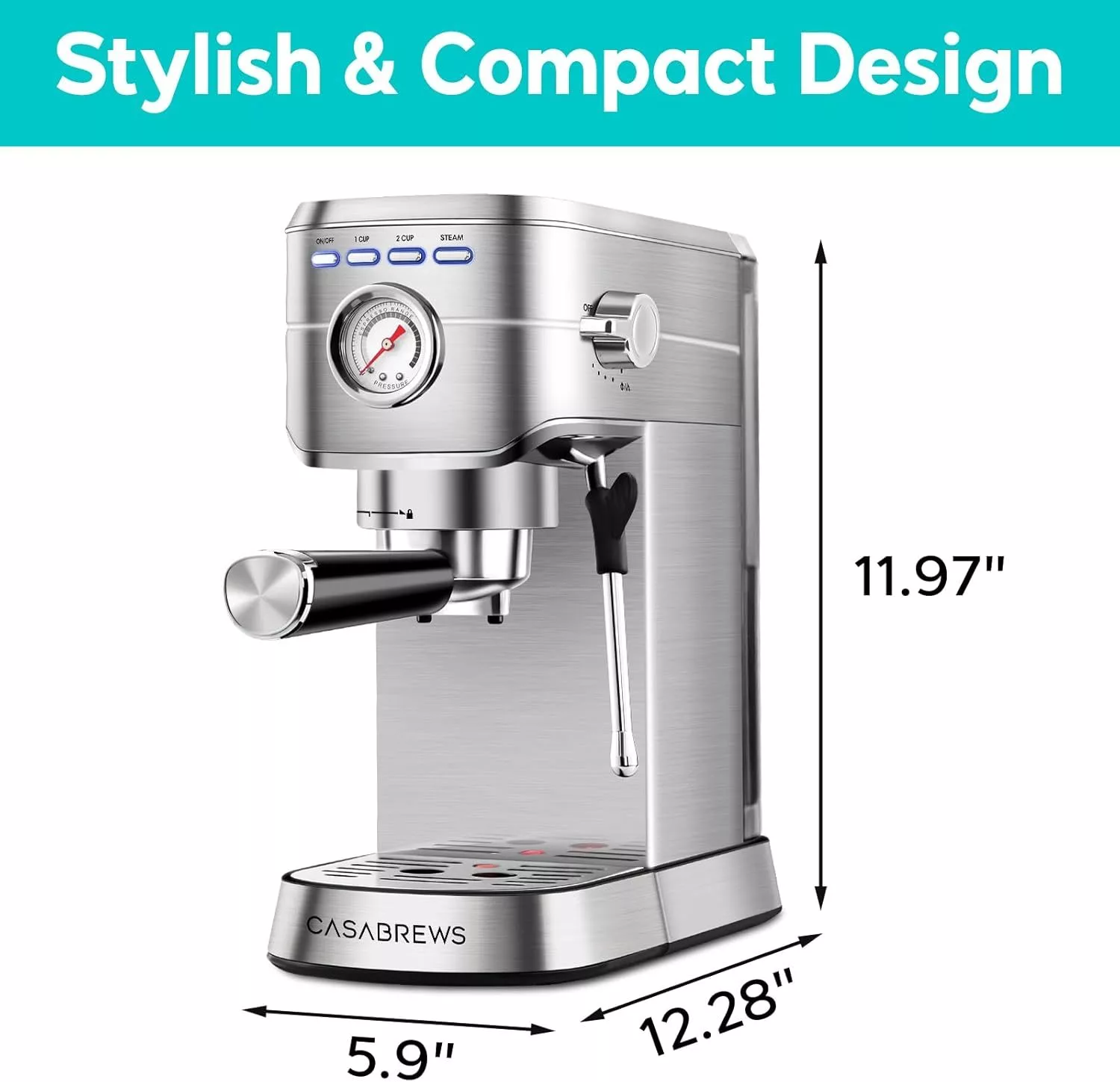 - Make Your Favorite Espresso Coffee At Home: The CASABREWS coffee machine with milk frother allows you to prepare all your favorite espresso-based coffees. You can enjoy a barista-brewed latte, cappuccino or macchiato at home. Stainless steel appearance, stylish and durable, ideal for any size kitchen. This compact espresso coffee maker is perfect for home or office use