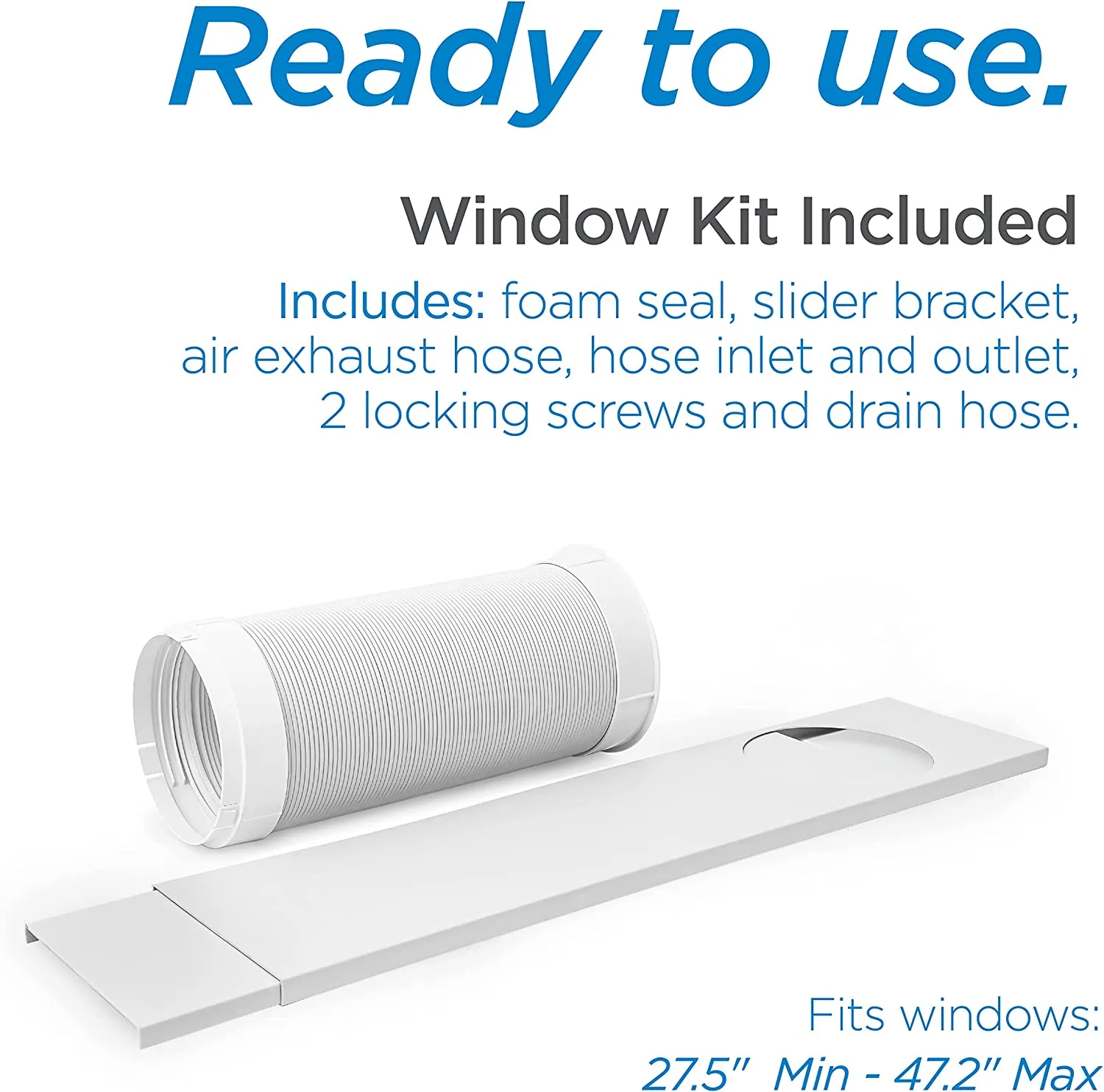 - SIMPLE & QUICK TO INSTALL: Just roll this portable ac air conditioner with 4 wheels into any room with a double hung or sliding window. Attach the included hose (4’ 11” long) & window adapter, & plug it in to an outlet using the 70.8 inch long power cord. When not in use, just unhook AC unit & store. Window kit includes foam seal, slider bracket, 5.9 inch diameter air exhaust hose, hose inlet and outlet, 2 locking screws and drain hose.