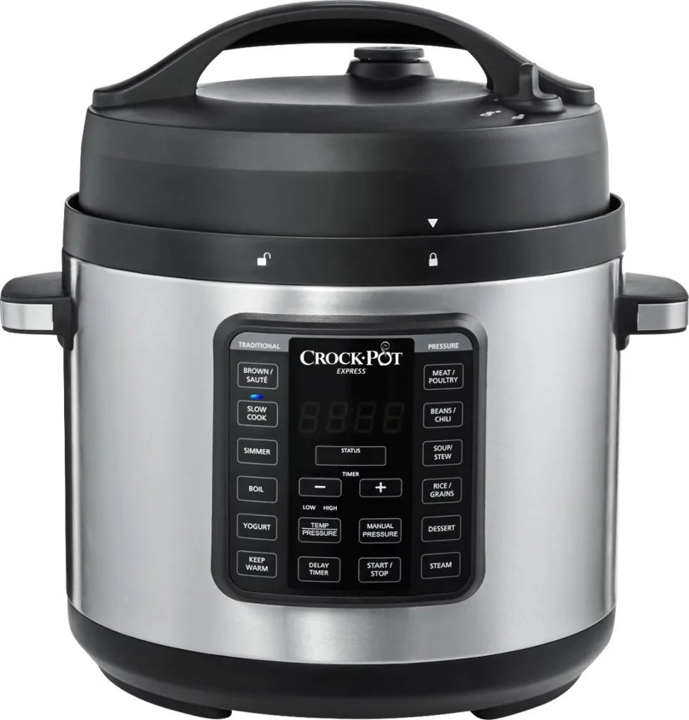 Pressure cook, slow cook, sear, sauté, boil, simmer, and steam with the Crock-Pot Express Easy Release. The Easy Release Multi-Cooker lets you pressure cook foods up to 70% faster than a conventional oven but also lets you drop in your favorite ingredients for a delectable slow-cooked meal. It features 3 innovative functions that will take your cooking to the next level. Manual Pressure lets you customize recipes by setting any cook time plus high or low pressure. Simmer Function cooks gently and slowly and helps thicken sauces, and Boil allows you to create more one-pot dishes, such as pasta, poached eggs, and more. When used as a pressure cooker, it features a front steam release dial to keep your hand safe and away from the hot steam being released. The nonstick cooking pot removes for easy cleanup and 6-quart capacity can serve over 7 people, perfect for family meals or large gatherings. The Crock-Pot Express also includes a recipe book, steaming rack, and spoon.