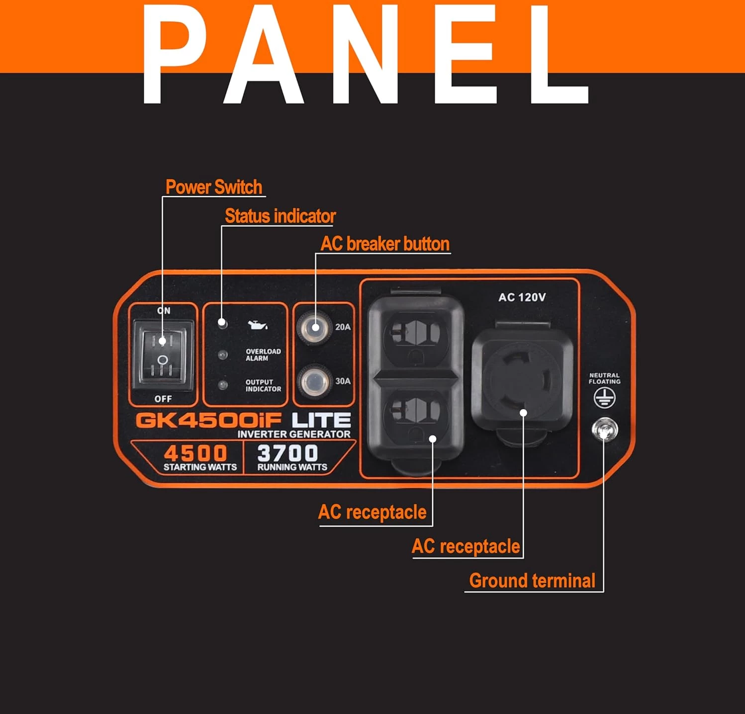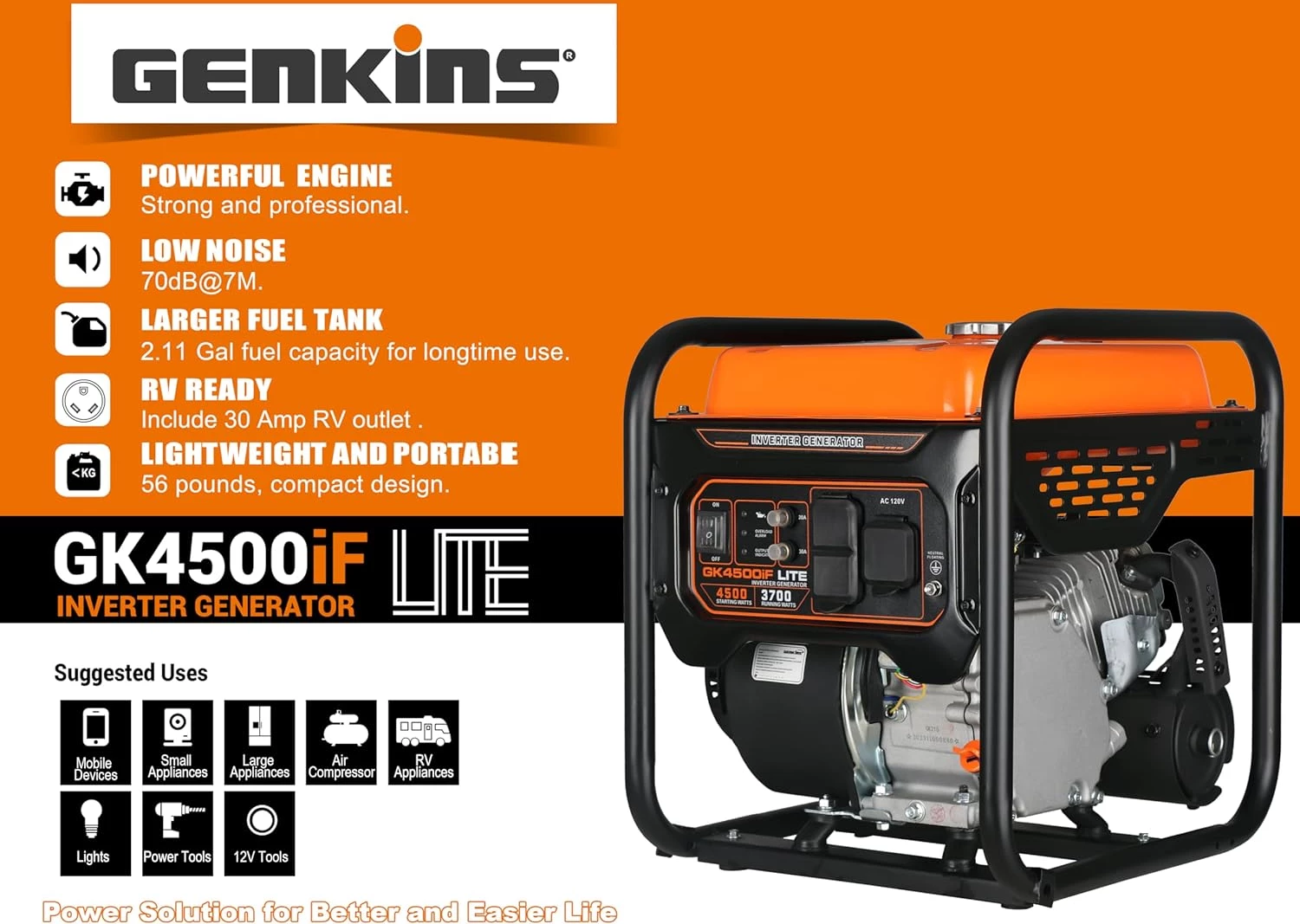 - ⚡ 4500 Peak Watts or 3700 Rated watts | Powered by Genkin’s 223CC Powered by Genkins Commercial class 223 cc 4-stroke OHV engine