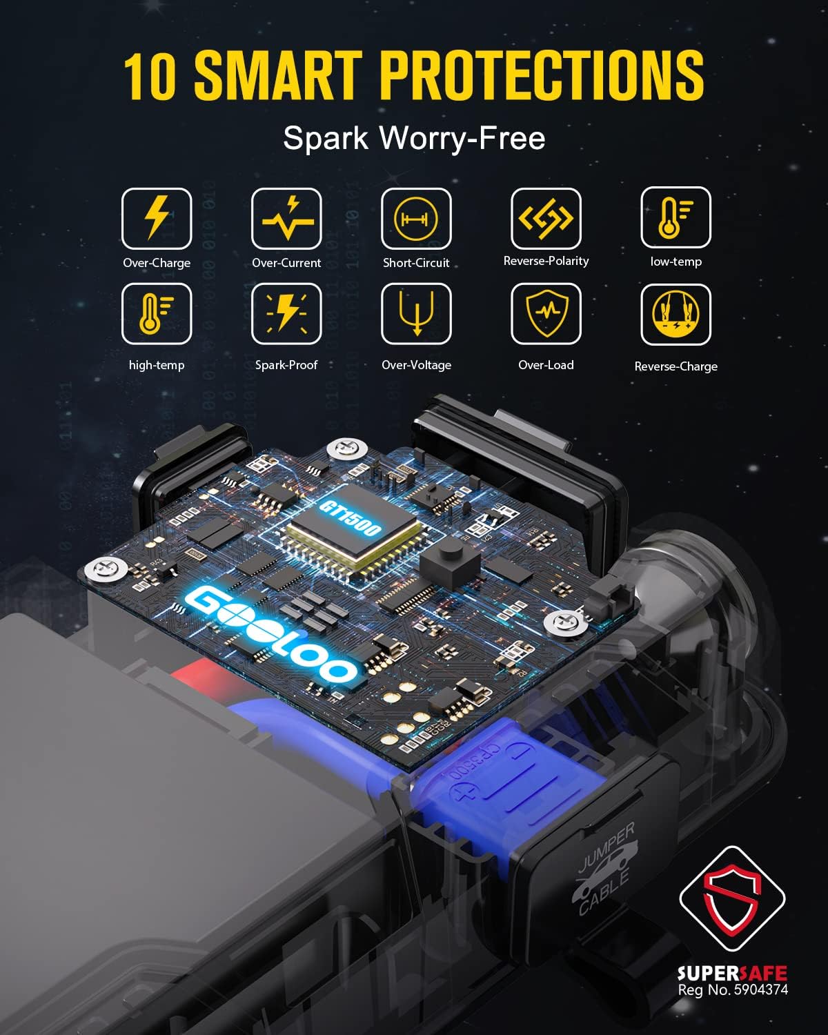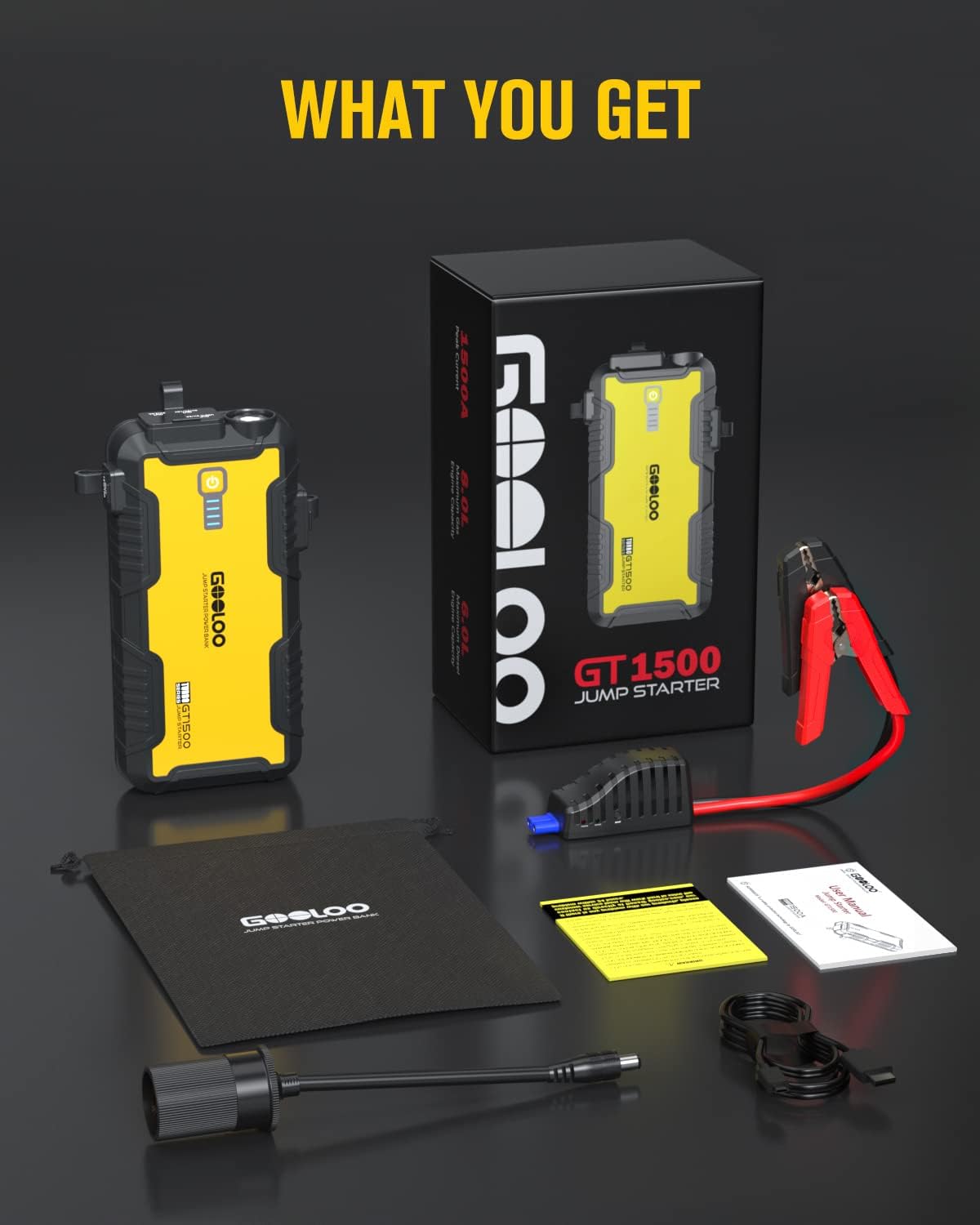 - WHAT’S INCLUDED: 1 x GOOLOO Compact GT1500 Lithium-ion Jump Starter, 1 x Smart Jumper Clamp, 1 x USB to Type C Cable, 1 x Carry Bag, 1 x User Manual (no wall charger included).