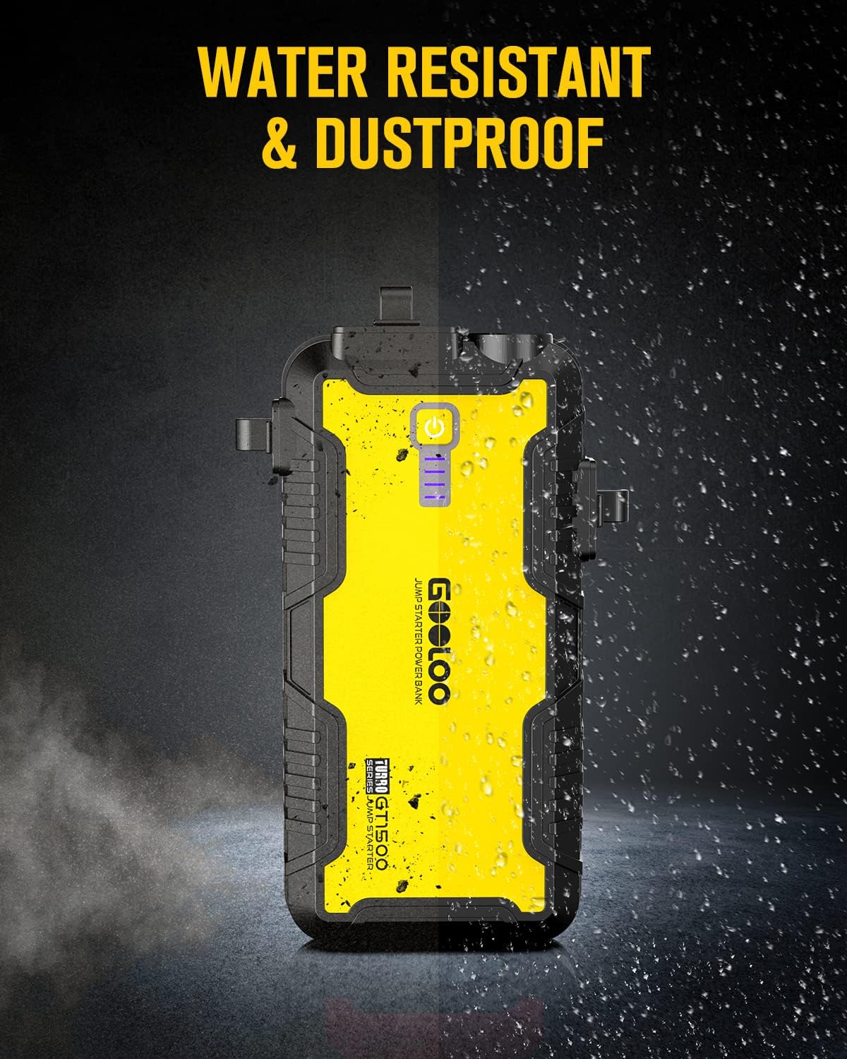 - POWERFUL CAR JUMP STARTER: The GOOLOO GT1500 portable lithium car battery jump starter pack can easily jump start a dead 12V battery in seconds with its 1500-amp peak current, even in extreme temperatures (-4°F~140°F)—workable for gasoline engines up to 8 liters and diesel engines up to 6 liters—up to 30 jump starts or can stand by for more than 12 months on a single full charge.