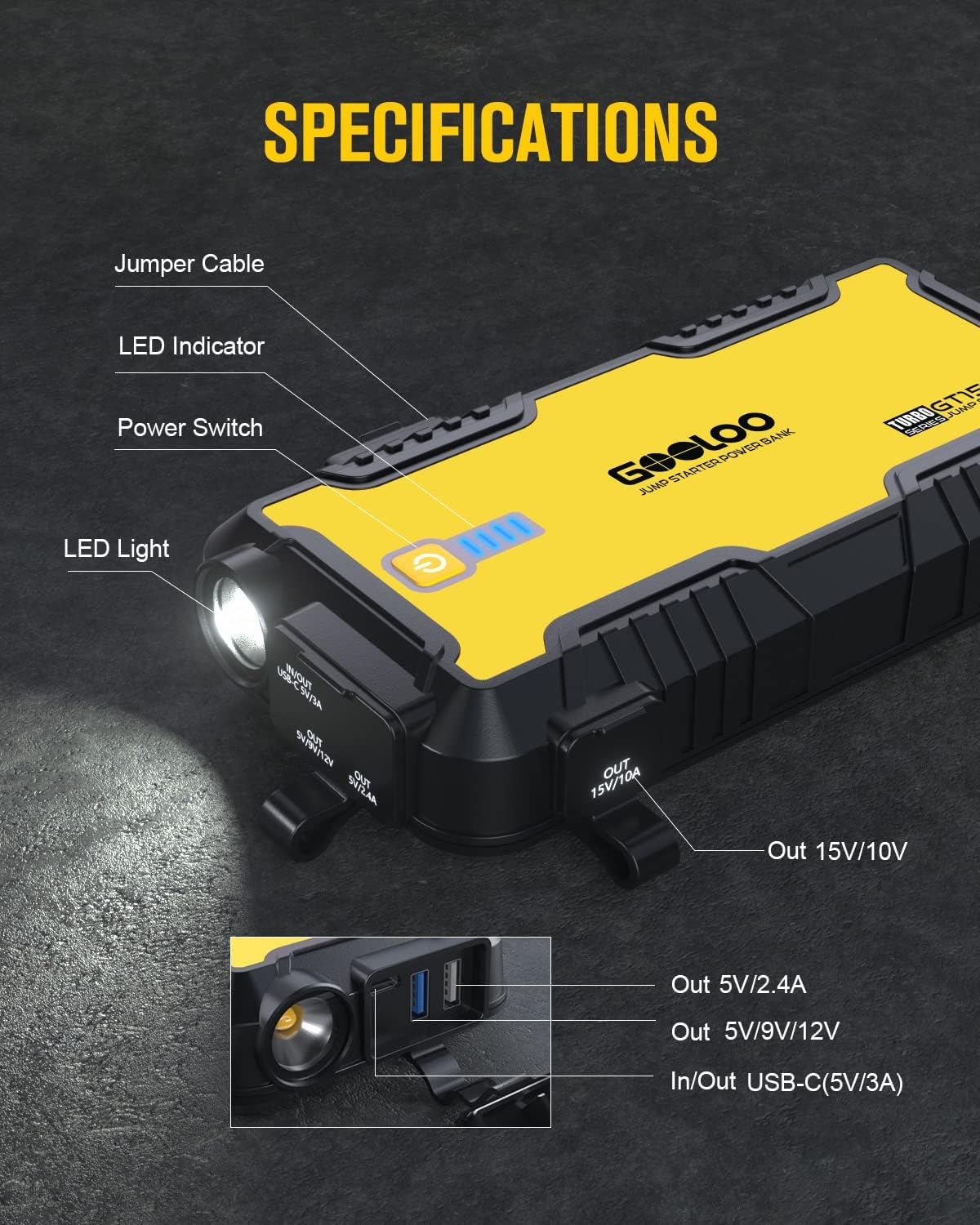 - MULTI-FUNCTION POWER PACK: The GOOLOO GT1500 portable car battery jump starter box is equipped with a 15W Type-C In/Out Port (5V-3A) and two USB ports (a QC3.0 port included) to recharge smartphones, tablets, or other USB devices. And a 15V/10A output to power tire inflator, portable car cuum, etc. Also can be used as a super bright LED light with 3 modes: Flash light, wardrobe light, and SOS light. A real lifesaver in emergency situations.