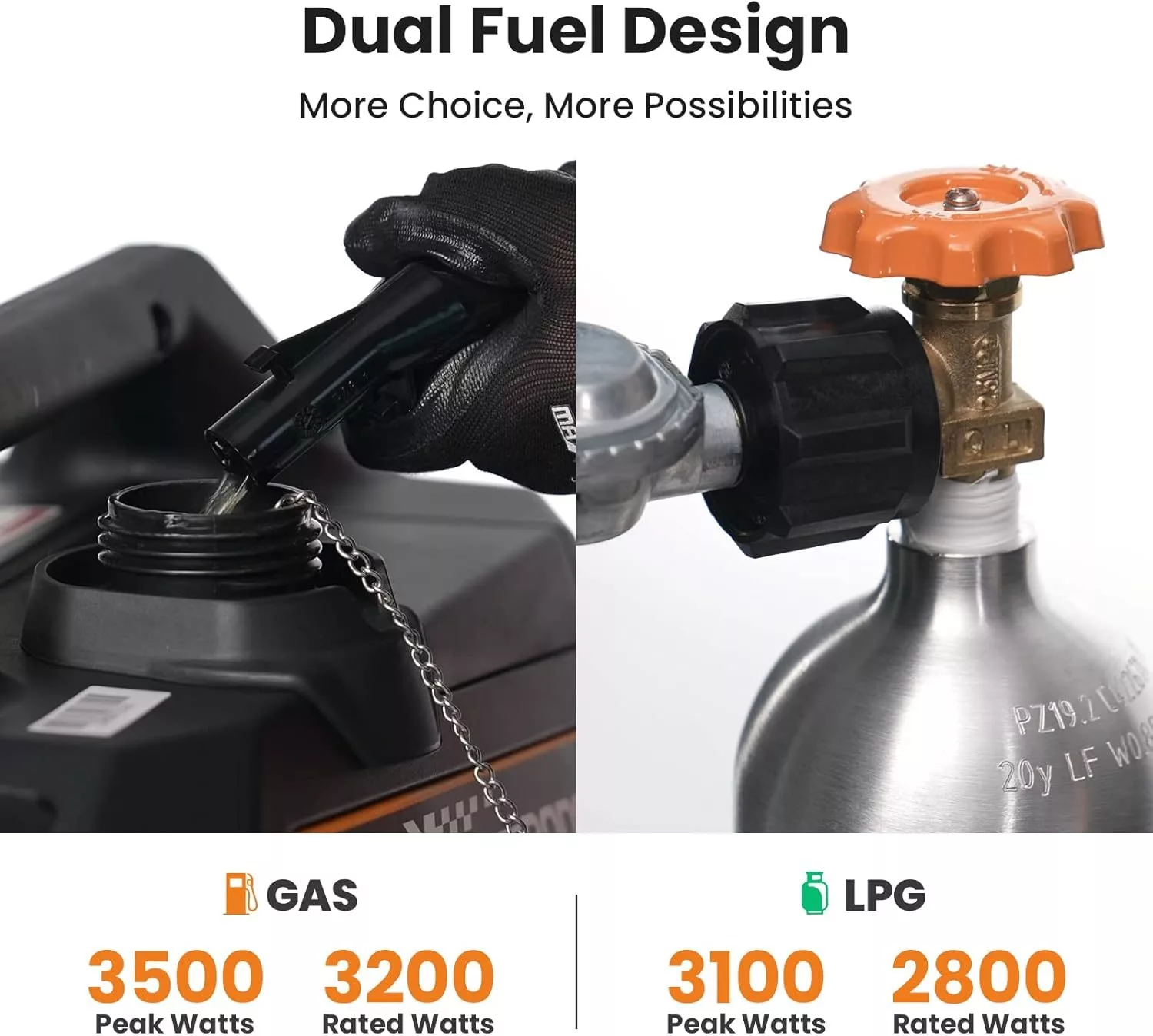 - Multipurpose power supply: Dual fuel design runs on both gasoline (3500 surge watts, 3200 rated watts) and propane (3100 surge watts, 2800 rated watts). Easily runs a small house lighting system or an RV’s 15k air conditioning unit or other equipment like the refrigerator, it is ideal for home backup power under extreme weather, or ourdoor camping with your RV.