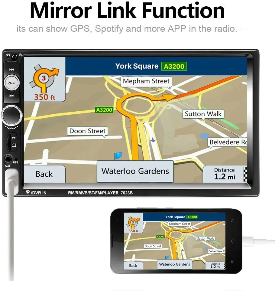 - Universal Double Din Car Stereo: 7 inch TFT HD Digital Multi-color touch screen, 1080P video format and 800 x 480 screen resolution, offers you great use experience. Support mirror link for Android smartphone to show navigation image on this radio. Note: the stereo player is not a GPS unit, it gets GPS navigation function by connecting to the phone.
