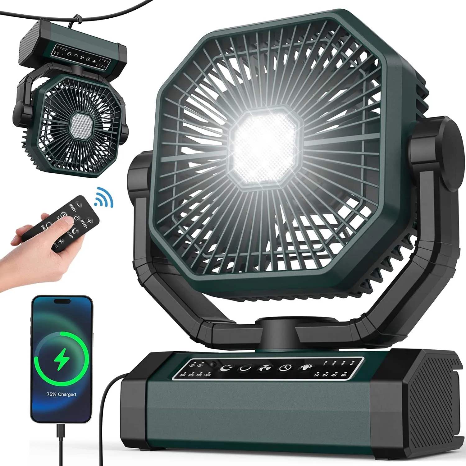- PORTABLE BATTERY FAN WITH Light & Hook: This portable camping fan offers 12 LED beads, 3 dimmable brightness functions for different occasions. Great portable fan for bedroom, Office, Camping, RV, Power Outage, Rtc. The 2-in-1 camping fan battery powered has a 360° rotating hidden hook so you can hang the fan up and adjust the right angle. In addition, it is also suitable for use indoors as a large battery operated fan. This would be a great gift for your family and friends.