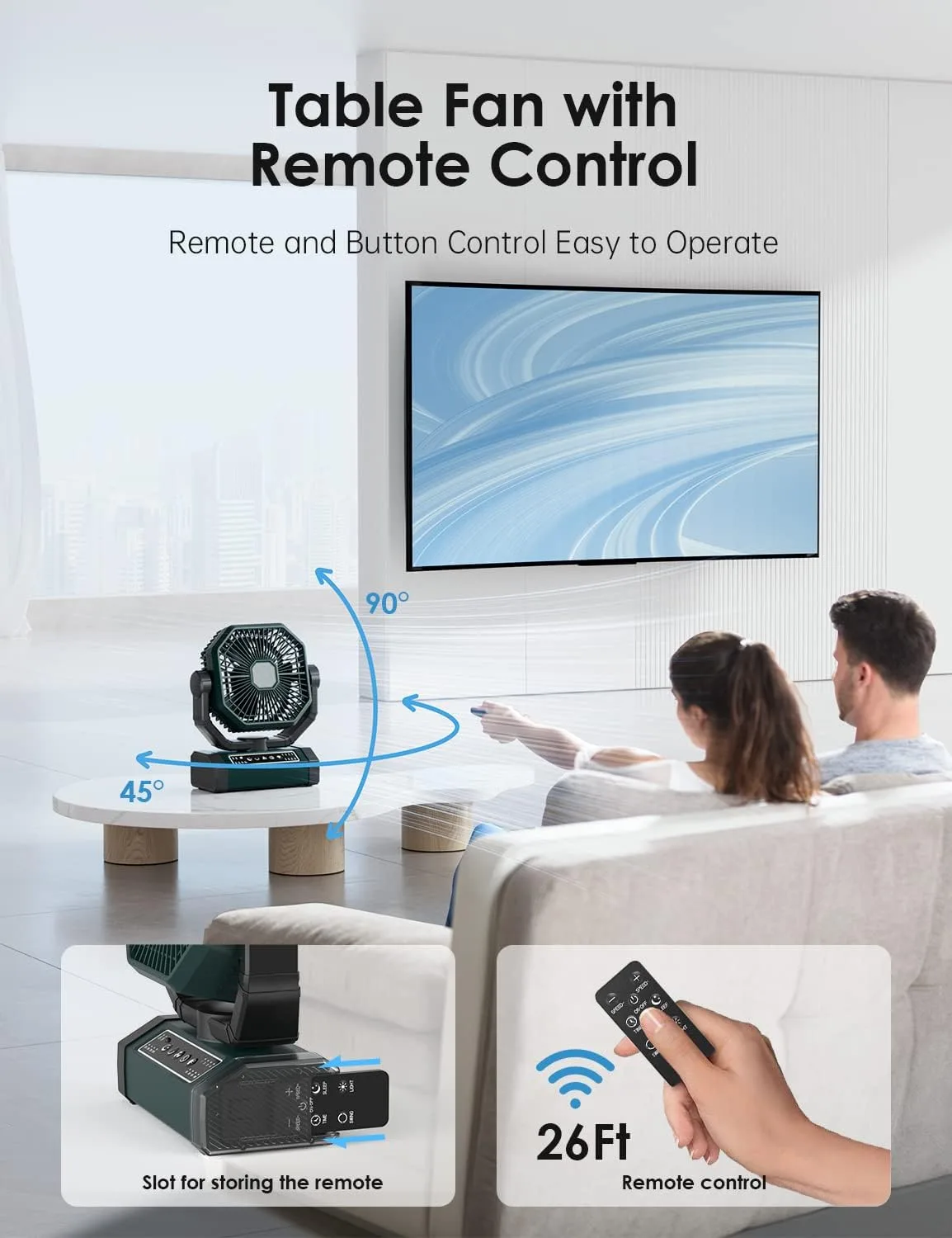 - RECHARGEABLE FAN CAMPING & SHAKING & REMOTE:This fan battery operated has 90° or 45° automatic swing, 270° swivel head, which can be rotated at will to improve comfort. In addition, the battery powered fan for camping is equipped with a remote control, so you can easily control the fan with the remote control or buttons within 26 feet. The remote control can be stored in the slot on the side of the base to avoid loss. Note: Please remove the insulating strip on the remote control before use.