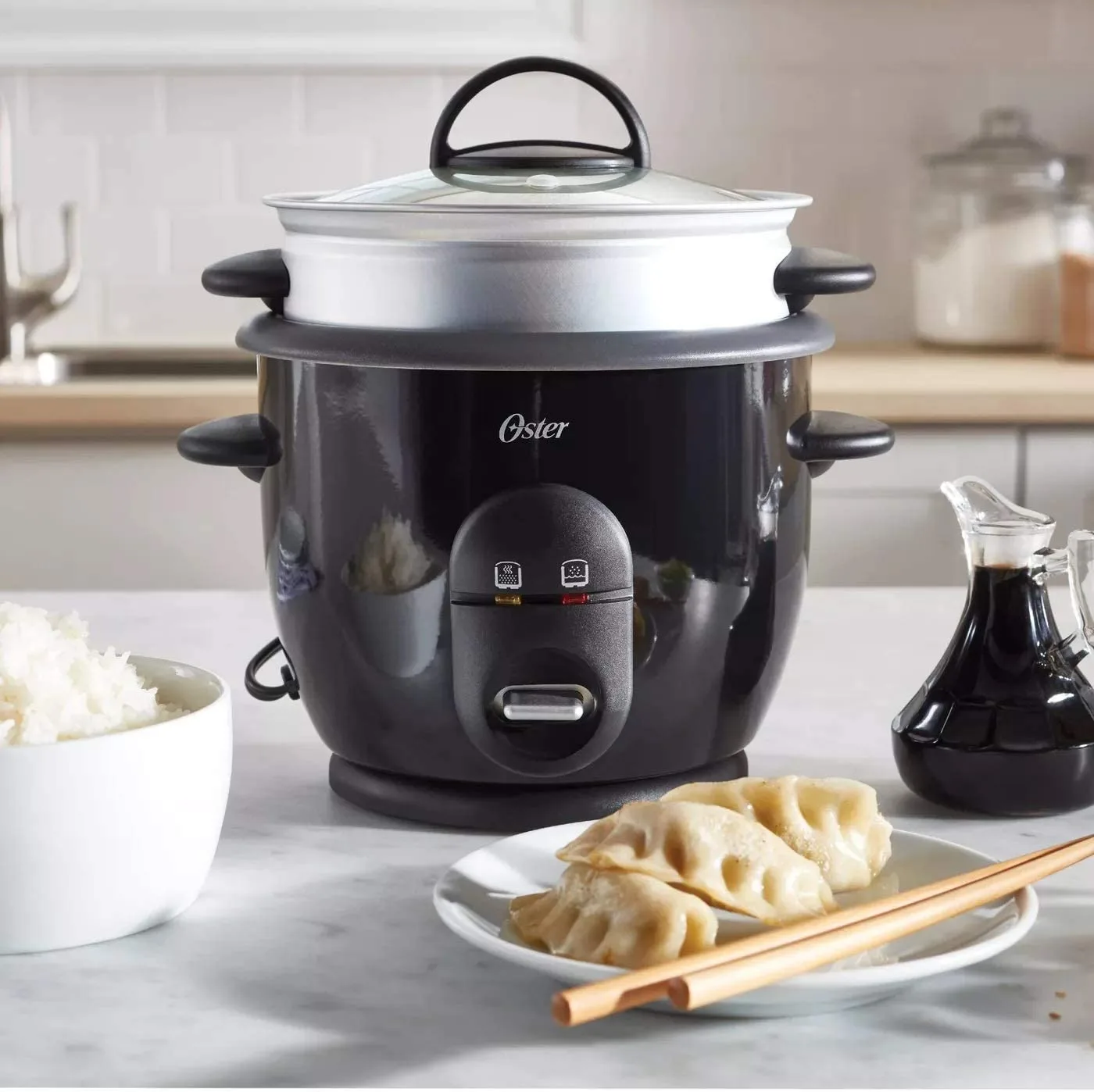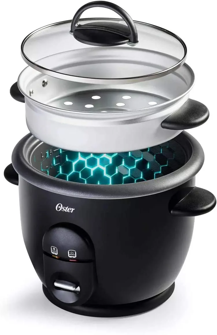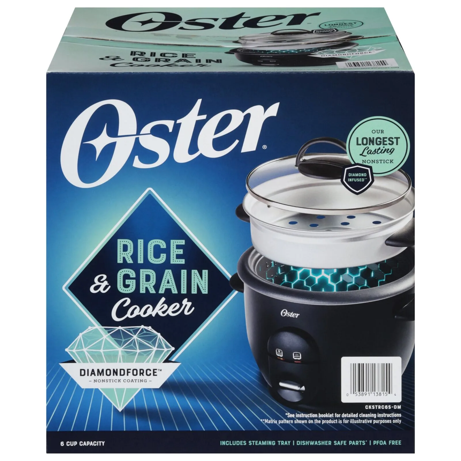 6-cup rice and grain cooker with steamer tray ideal for rice, grains, soups, oatmeal, grits, and more! Includes DiamondForce nonstick coating, Oster’s longest-lasting nonstick yet. DiamondForce Nonstick is infused with diamond particles that form a structural matrix, creating a stronger coating to provide easy food release and superior nonstick performance over time.