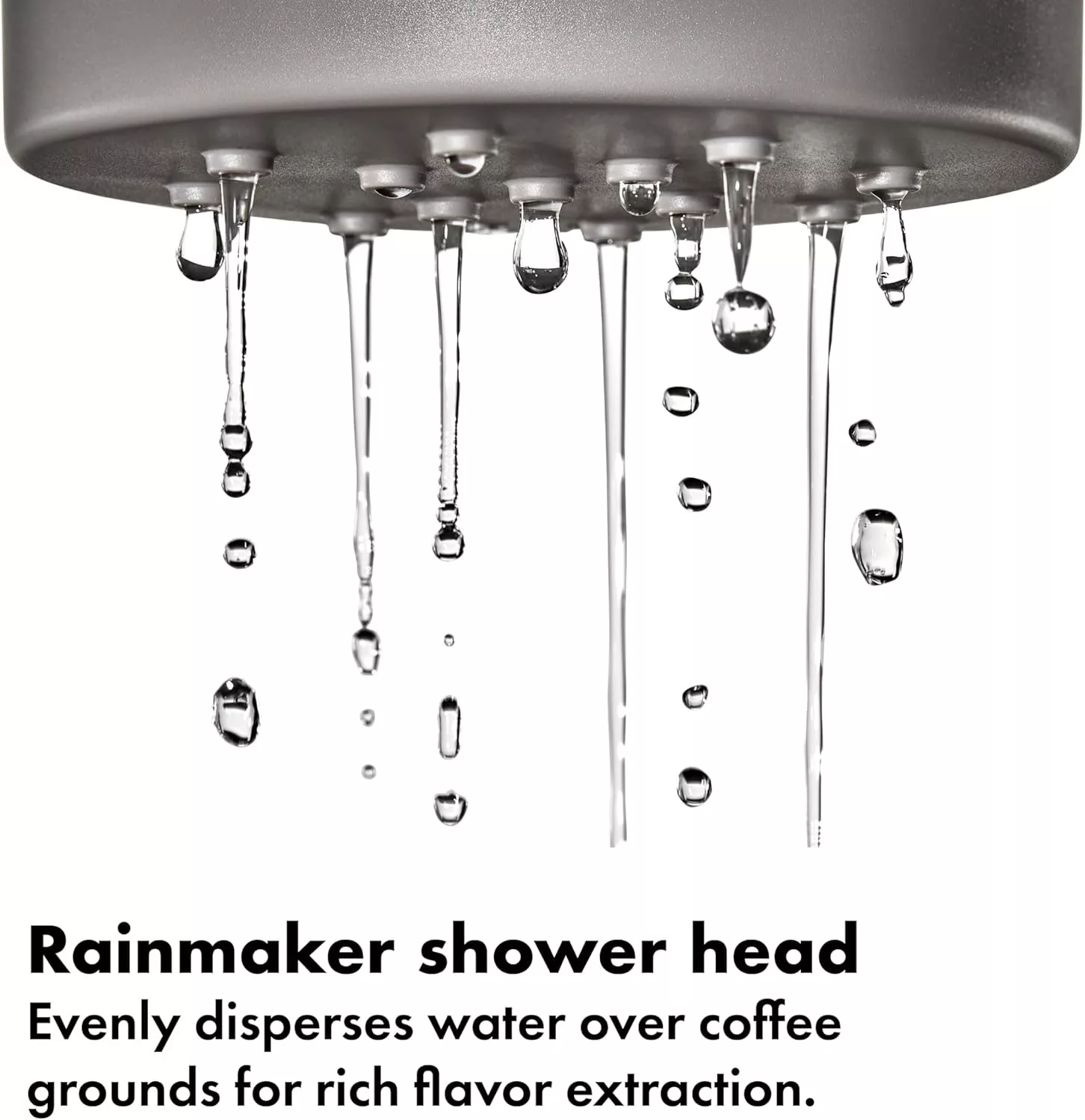 - Rainmaker shower head evenly disperses water over coffee grounds for better flavor extraction