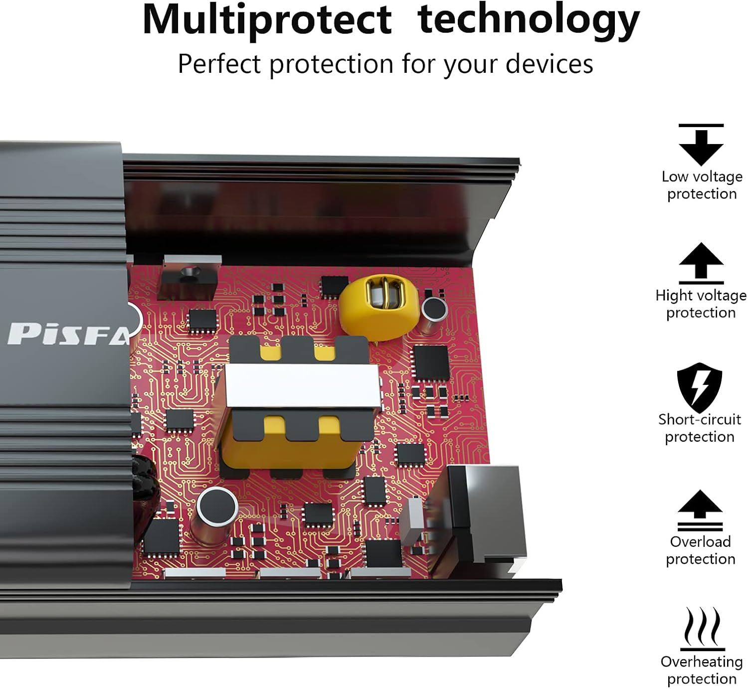 - Double protection mechanism: Smart chip + built-in fuse double protection mechanism. Once the product detects a fault by itself, the inverter will automatically turn off the current output and light up a red light to remind the user, avoiding the trouble of replacing the fuse.