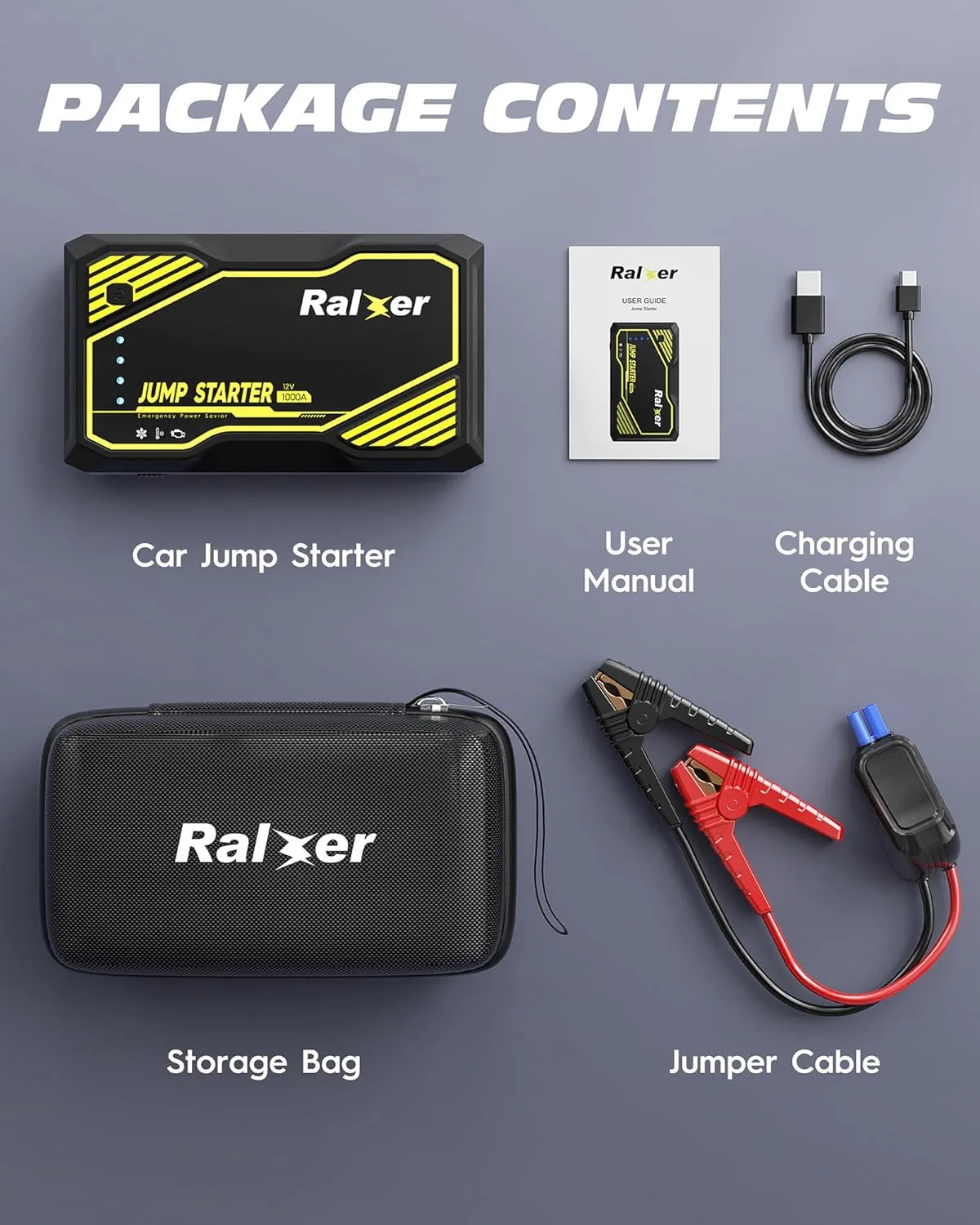 - Package Included: Your package includes the following accessories: 1 x jump starter, 2 x jumper clamps, 1 x USB cable, 1 x carry case, and 1 x user guide. Please feel free to contact us. We will give you a satisfying solution in 7 hours if you receive defective items.