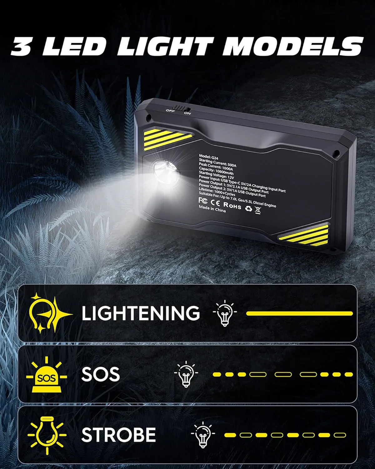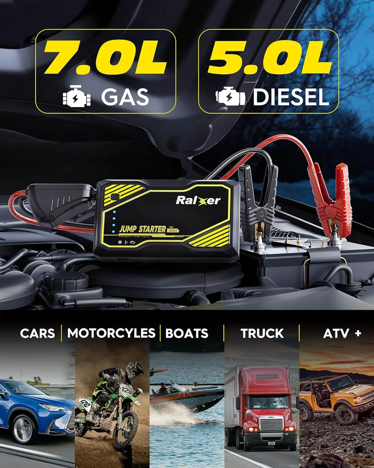 - Strong starting ability: Our battery jump starter reaches 1000A peak current, which can help you quickly start a 12V car, SUV, or truck (up to 7.0L gas or 5.5L diesel engines). It can deal with the challenge of starting the car battery in a -4℉ environment at any time, reduce the startup temperature increase, and start the car safely.