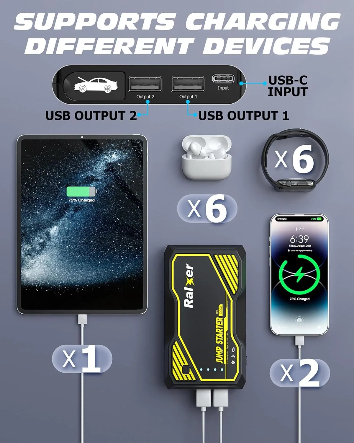 - Multifunctional: Our jump starter acts as a USB power bank. You can charge your mobile phones or laptops with the 5V/2.1A USB output port. It also comes with a super bright LED, which is used as an emergency flashlight with a strobe and SOS signal.