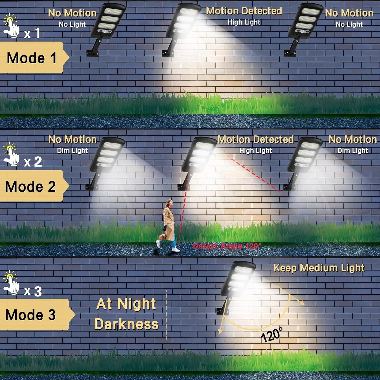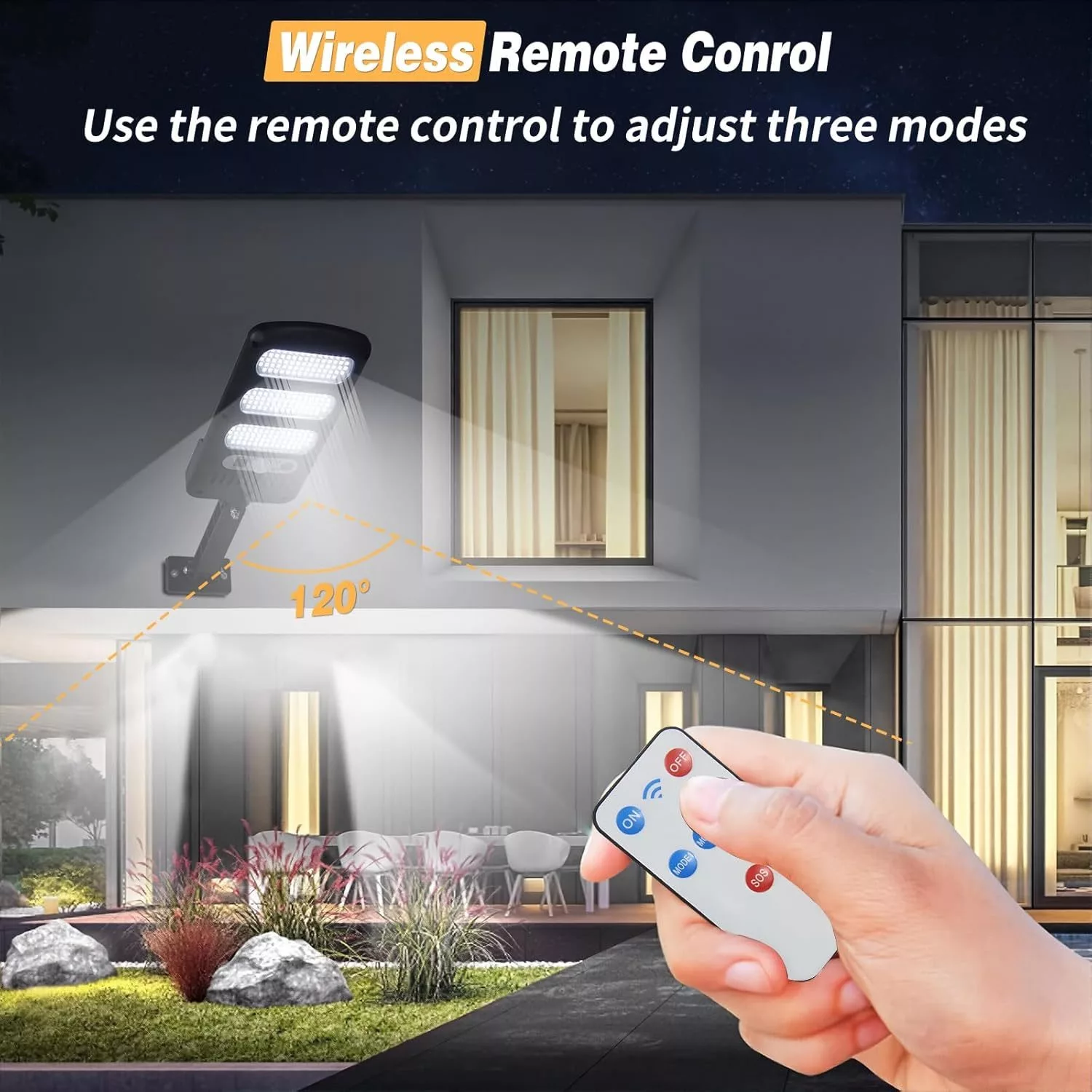 • 3 Lighting Modes & Wireless Control: 1) Sensor mode: Auto turns on at night when it detects motion and stays on for another 15s after object leaves. 2) Dim Light Sensor Mode: Auto turns on dim light at night and turns brighter when it detects motion. 3) Constantly on mode: Auto turn on dim light at dusk and turns off at dawn. With wireless remote control, it is convenient to switch modes freely.