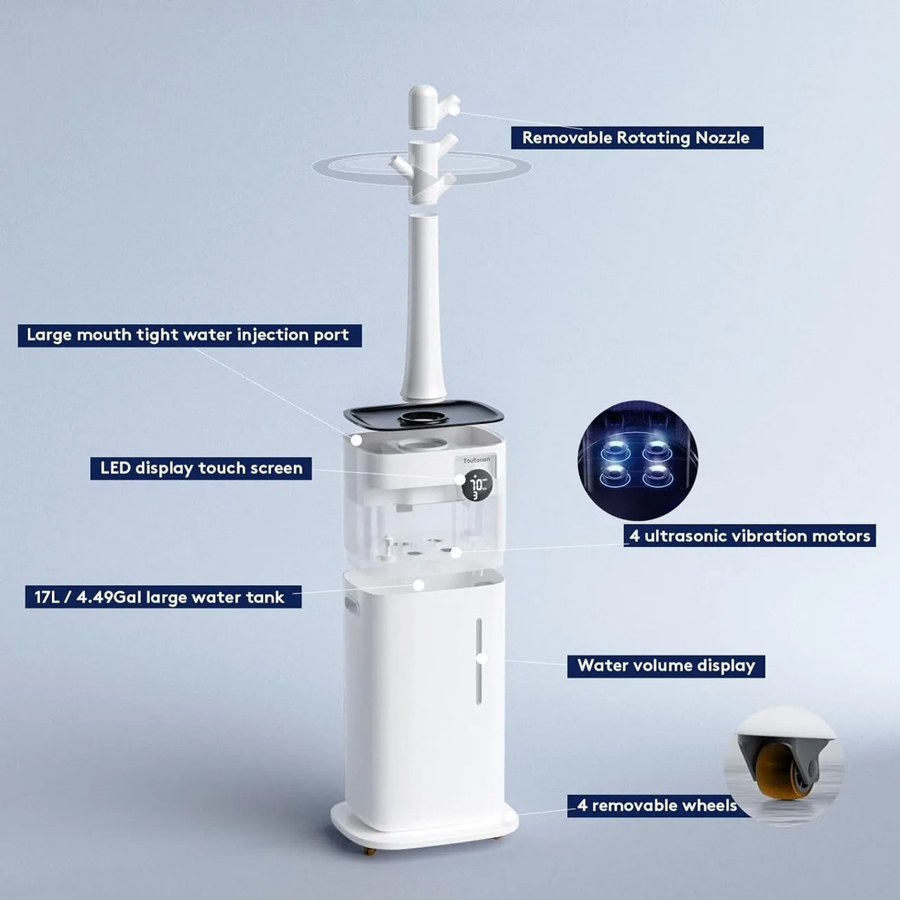 Revitalize your living space with our 5.2-Gallon Top-Fill Cool Mist Tower Humidifier, offering a large-capacity water tank for extended use. The 360° rotatable nozzle with four adjustable segments ensures uniform mist distribution throughout the room. Experience convenient control with the included remote, while the attached wheels make maneuvering a breeze. Enjoy a peaceful environment with super low noise operation. Cleaning is a breeze with the easy-to-clean design, and the humidifier’s energy-efficient performance is complemented by its anti-leak design for worry-free use. Transform your space into a comfortable oasis with this top-fill cool mist tower humidifier, designed for ease, efficiency, and enhanced air quality.Large-capacity water tank
