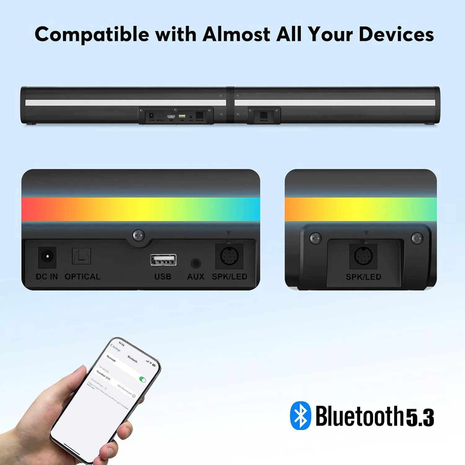 - Multiple Connections: Enjoy wireless music streaming from your phone, tablet, or other Bluetooth-enabled devices with Bluetooth 5.3. Wired connections include optical, AUX, and USB, making it compatible with smart TVs, 4K and traditional TVs, computers, projectors, phones, tablets, and more. (Not support HDMI)