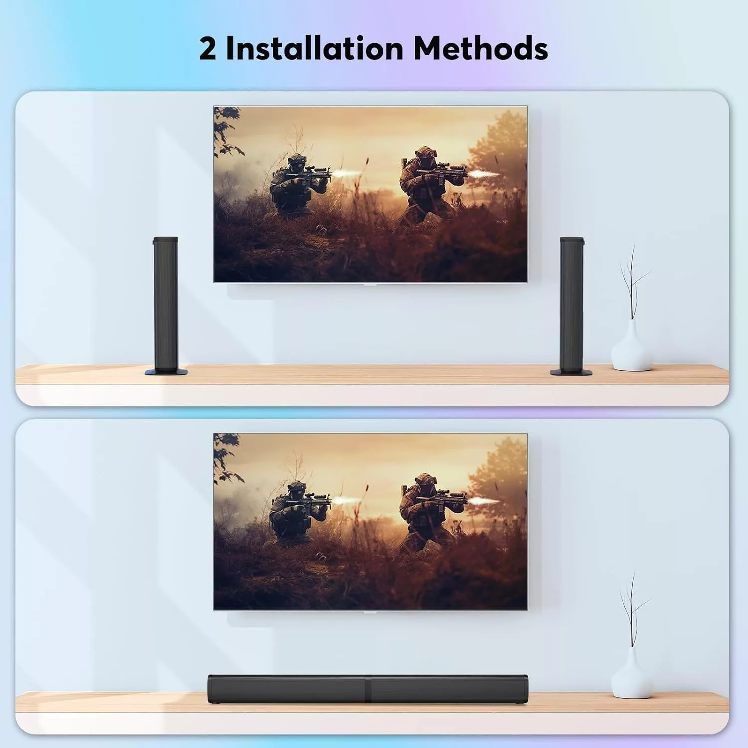 - 2.2 Channel Detachable Design: Use this soundbar system as two 16″ tower speakers for extensive stereo effects and surround sound, or combine them into a 32″ long soundbar to save space.