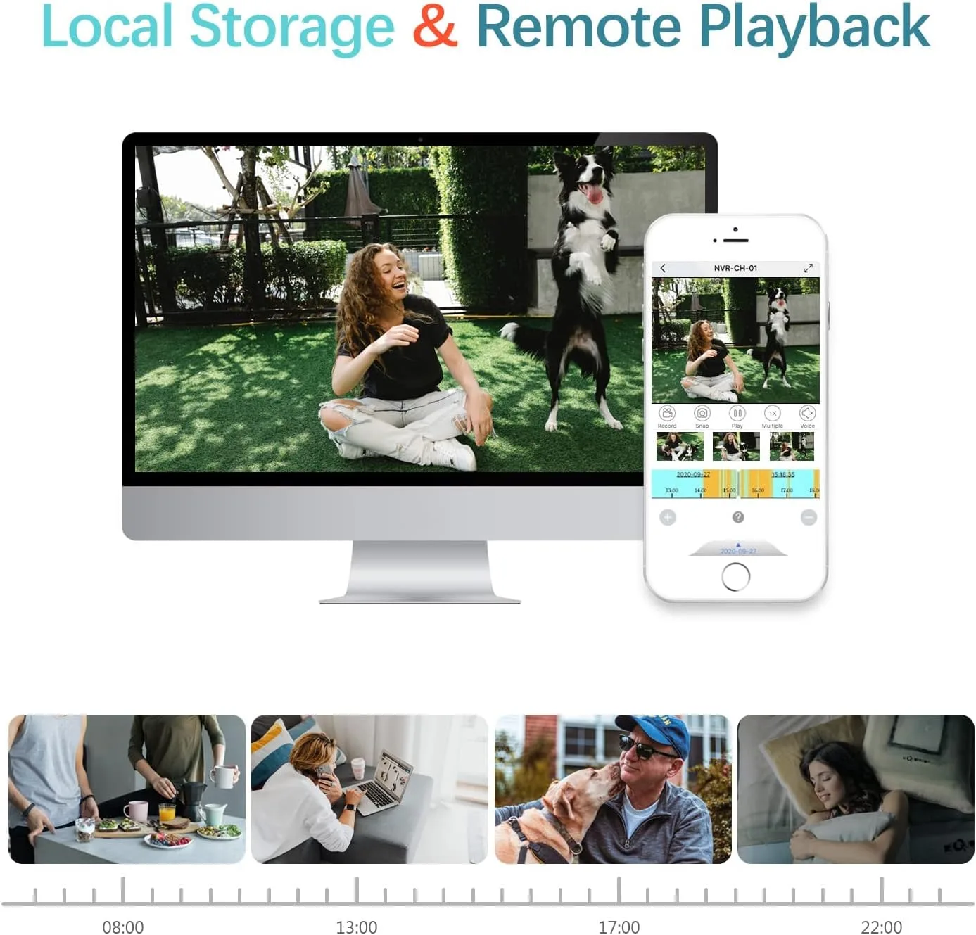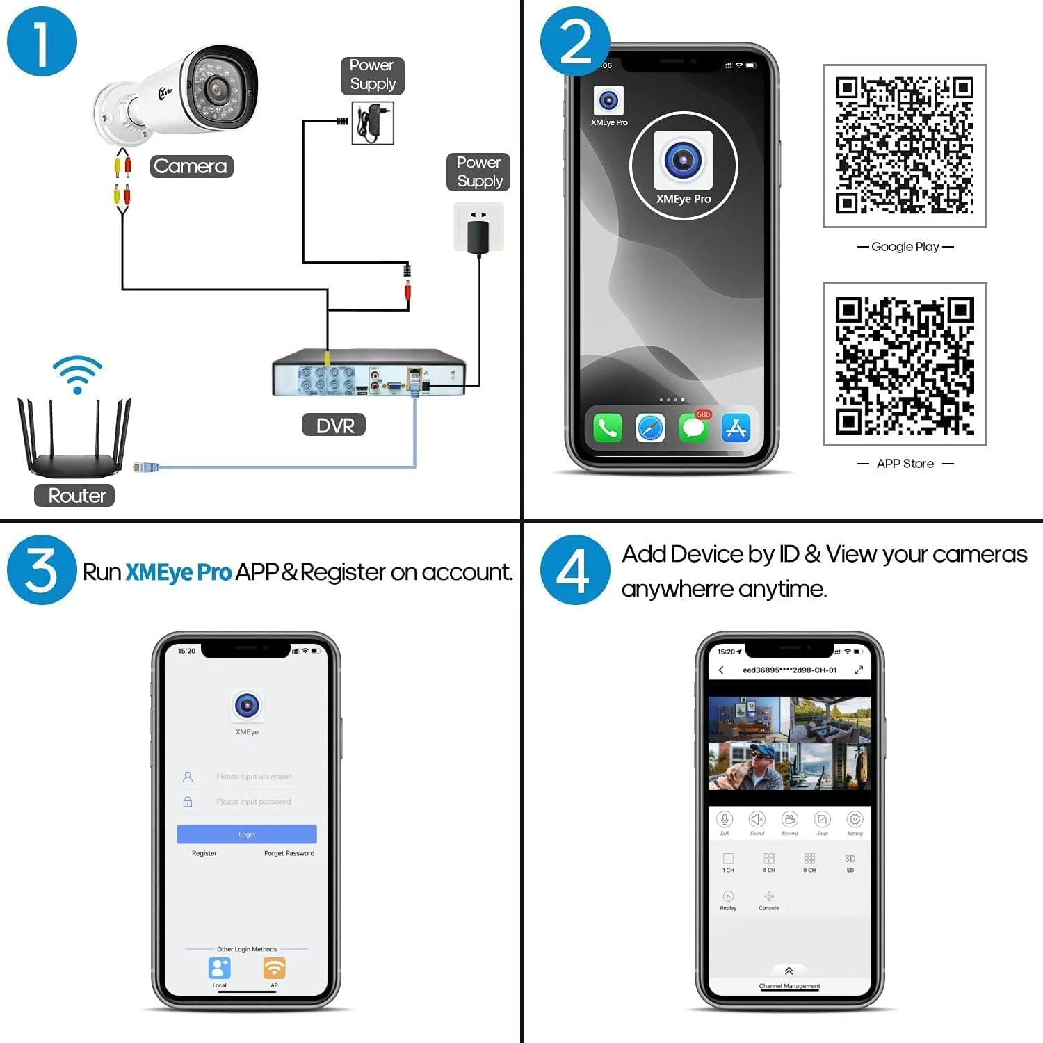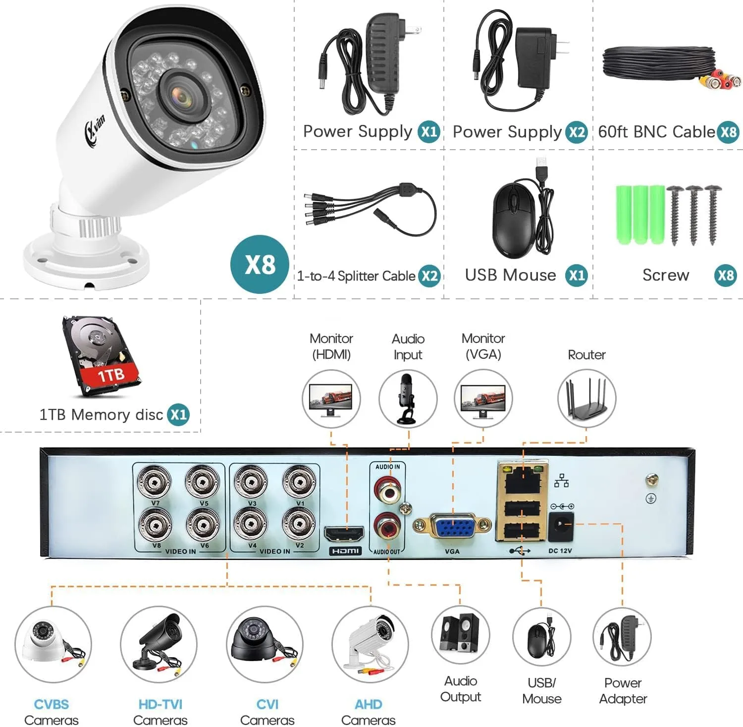 The XVIM 8CH 1080P Night Vision Outdoor CCTV Security Camera System is a comprehensive solution for home security. It includes eight white security cameras and a DVR that supports up to 5MP resolution, with features such as 5in1, HDMI&VGA, P2P, and remote viewing on PC/Phone. The system is designed for both indoor and outdoor use, with cameras that are weatherproof and resistant to harsh elements. With a 1TB hard drive included, the system allows for continuous recording, time-scheduled recording, or motion detection recording. The DVR supports multiple languages and has an intuitive interface for easy setup and monitoring. The cameras have a bracket for easy wall mounting and are equipped with night vision, IR-Cut, and a contrast ratio of 1200:1 for clear vision in various conditions. The system is compatible with Amazon Fire TV, Smart TV, and XVIM for seamless integration into a smart home setup..