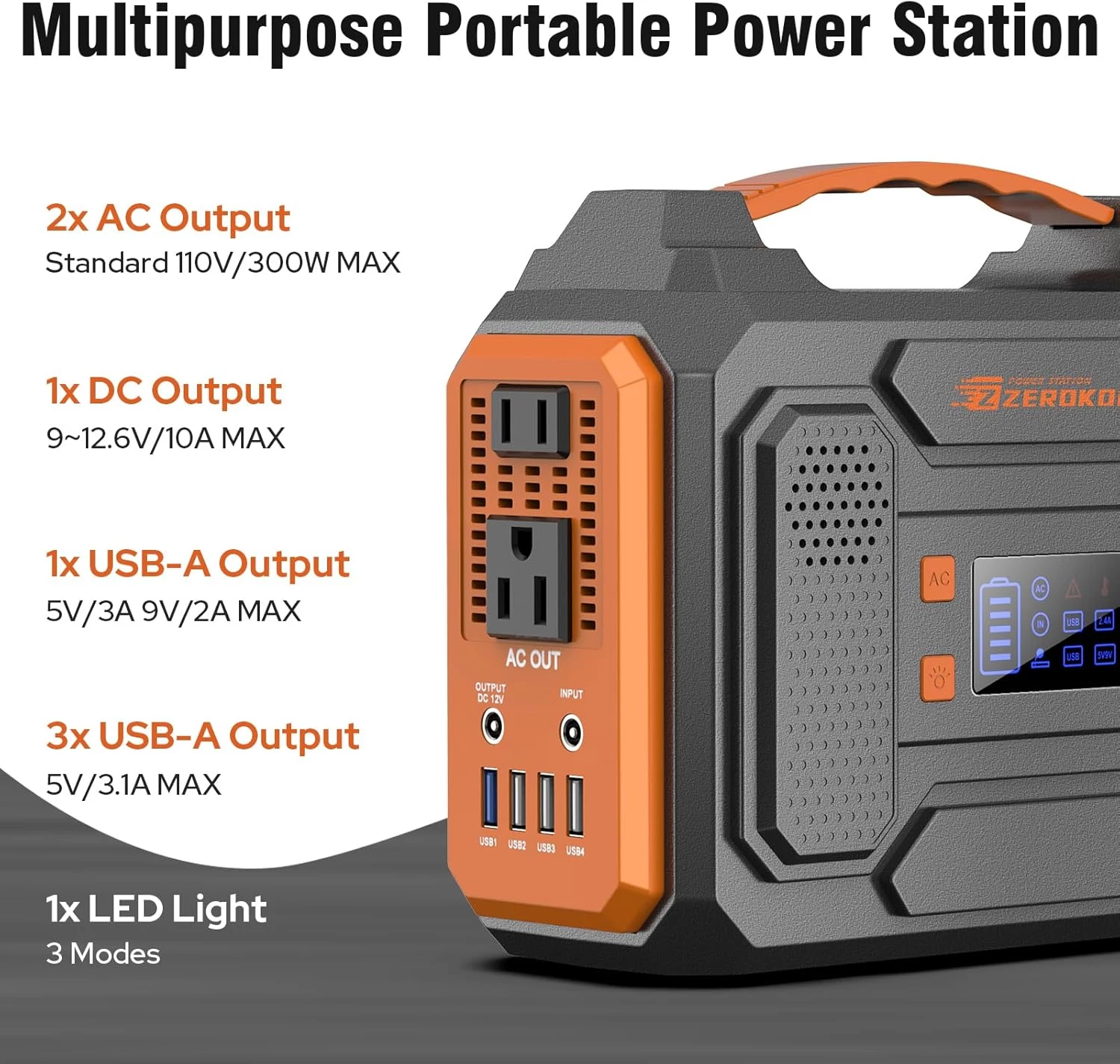 - Portable Generator with 60W Solar Panel Included: With a superior lithium-ion battery pack, ZeroKor 300W power stations are powerful enough to charge smartphones,tablets,laptops,headphones or other outdoor Small Camping supplies (Tips:Using electrical appliances over 300W may damage the portable solar generator, especially some devices that are prone to heat or built-in air compressor such as coffee maker,Hair dryer, water pump etc )